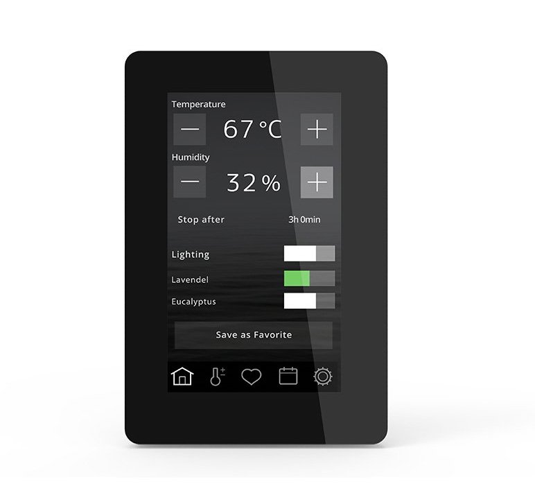 Fügen Sie Funktionen wie Zusatzlüfter, Duftpumpen oder Licht hinzu- das Elite Cloud-Bedienfeld steuert alles mit klarer und übersichtlicher Präzision. Der 4,5-Zoll-Touchscreen liefert den Echtzeit-Status zu jedem Aspekt Ihrer Sauna.