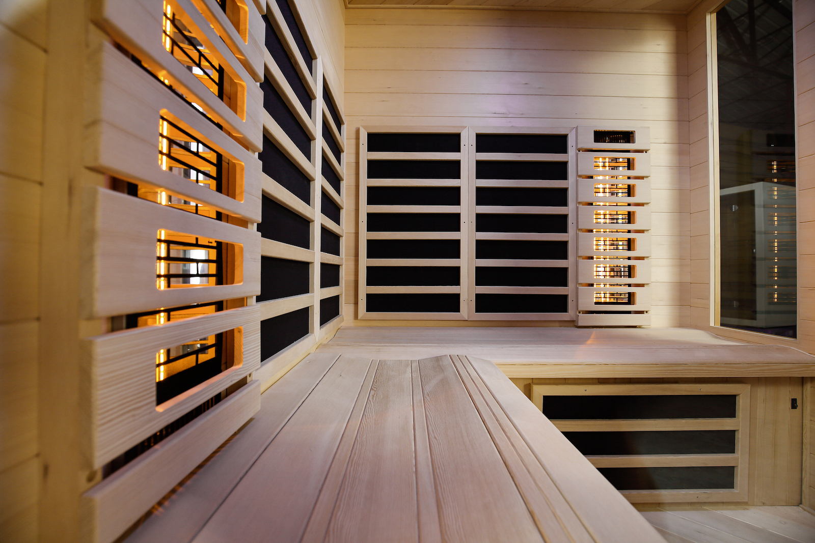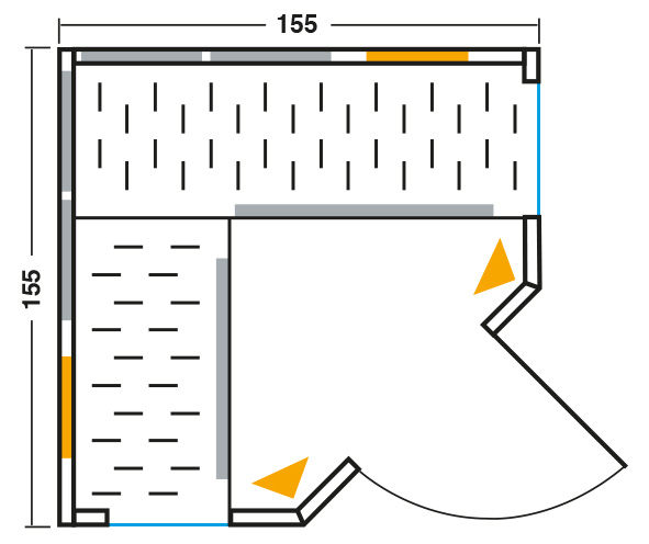 (Optional gegen Aufpreis erhältlich: bis zu zwei Eckstrahler links und rechts neben der Tür für eine optimale Wärmeentwicklung auch von vorne)
